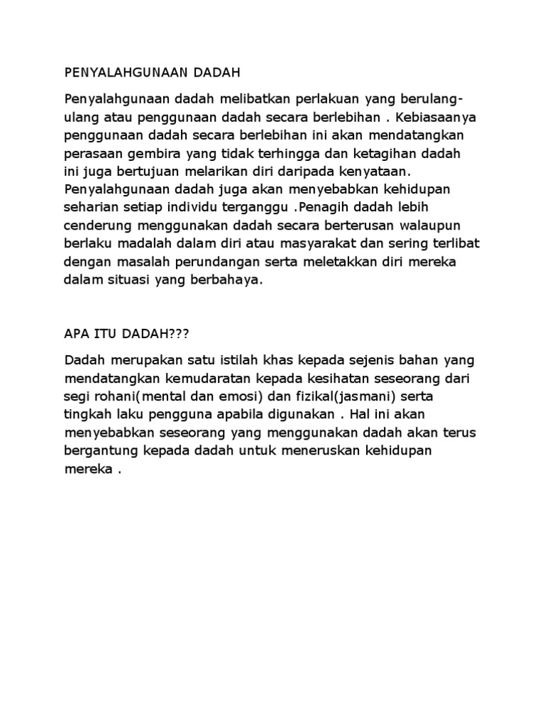 Kesan Dan Punca Penyalahgunaan Dadah from imgv2-1-f.scribdassets.com Penyalahgunaan dadah juga menyebabkan tekanan darah tinggi, masalah jantung, kerosakkan hati dan kelemahan sistem keimunan pengguna. Semoga apa yang dipertontonkan menjadi ikhtibar kepada anda semua. 3ejala penyalahgunaan dadah bukan hanya mendatangkan kesan(kesan negatif terhadap diri tetapi ia juga mampu menyebarkan kesan(kesan negatif !bu bapa harus memastikan hubungan setiap ahli keluarga sentiasa baik dan bersefahaman. Karangan berdasarkan bahan rangsangan (bahagian a). Penyalahgunaan dadah ialah satu perlakuan yang tidak. Jauhilah dadah, sesungguhnya ia pembunuh no.1 di dunia. Masalah disiplin dengan penyalahgunaan dadah. Penyalahgunaan dadah / bahan terlarang melibatkan pola songsang penyalahgunaan dadah yang akhirnya boleh mengganggu kehidupan seharian tidak memberi kesan terhadap tingkah laku.