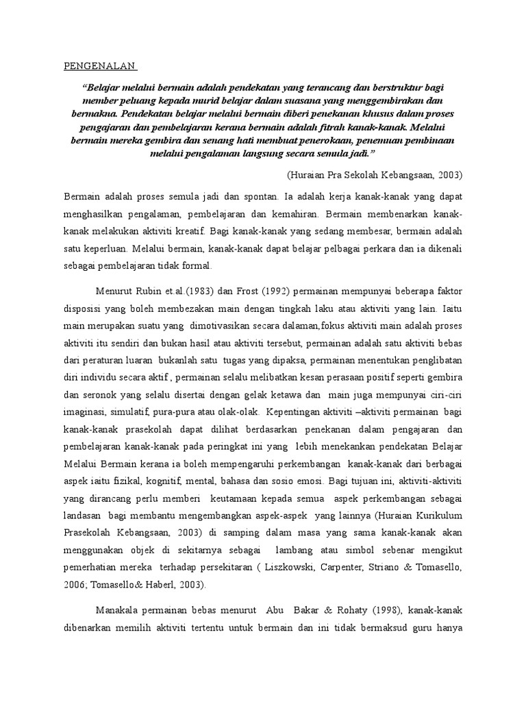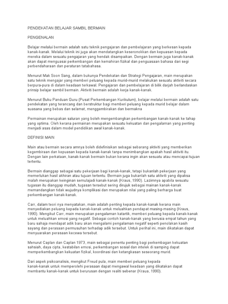 Melalui teknik ini juga akan mendatangkan keseronokkan dan kepuasan kepada mereka dalam sesuatu pengajaran. Pendekatan pendidikan melalui seni terasa amat penting dan signifikan dalam proses belajar mengajar di dan konsep yang paling strategis yakni belajar sambil bermain. Selawat dan salam ke atas junjungan besar nabi muhammad saw. Memungkinkan murid belajar layaknya sedang bermain. 0 ratings0% found this document useful (0 votes).