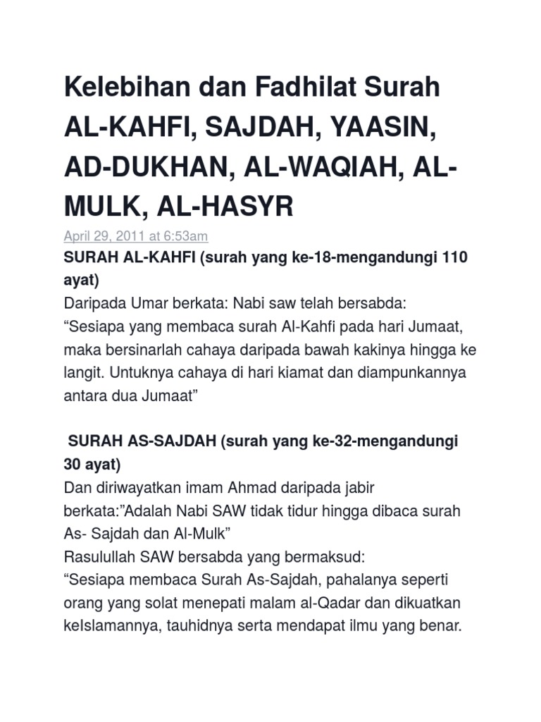 Nabi muhammad saw bersabda bahwa dengan rajin membaca surat ini pada hari jumaat maka akan terhindar dari fitnah tersebut. Daripada muaz ibnu anas al juhani daripada bapanya. Surat al kahfi atau ashabul kahfi adalah salah satu surat dalam al qur an yang ada dalam juz 15 dan di awal juz 16. Seseorang yang terlupa akan sesuatu perkara dituntut untuk memperbanyakkan mengingati allah supaya allah s.w.t membantu dirinya mengingati semula perkara tersebut. Untuknya cahaya di hari kiamat dan diampunkannya antara dua jumaat