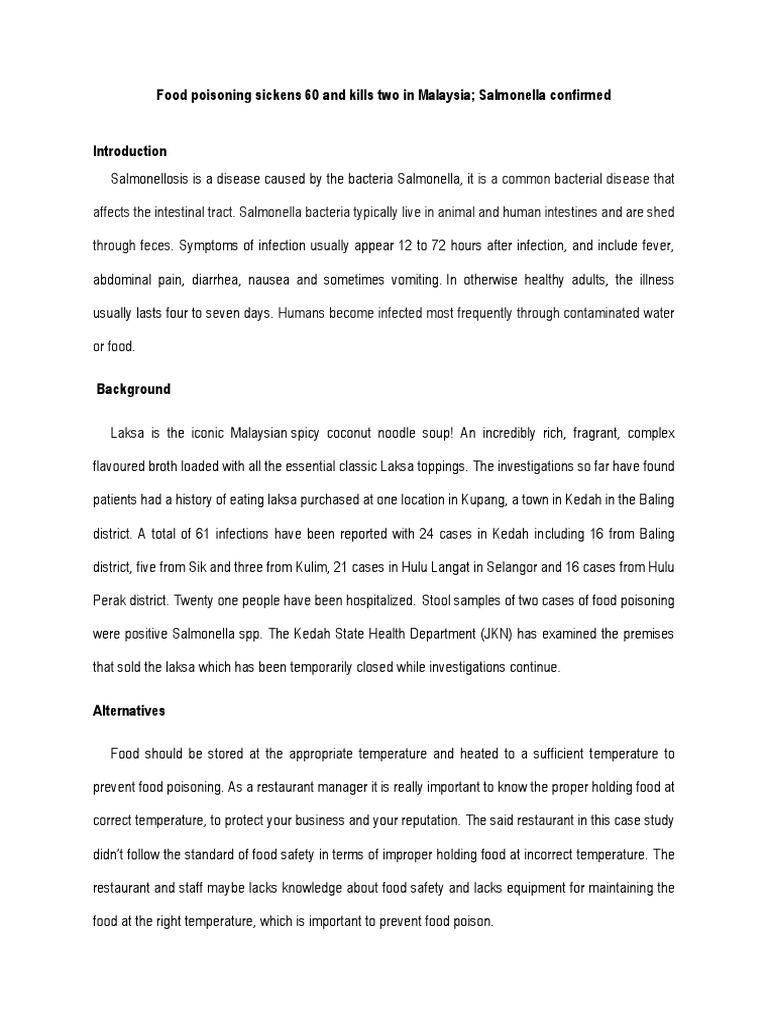 These corpuses are further analyzed by using antc onc which includes a. Food poisoning means getting sick from eating food with poisonous stuff in it. According to the recent studies around 76 investigating the causes of food poisoning introduction: From ground beef to lettuce, many foods can cause them. To enable wide dissemination of news that is in public interest, we have increased the number of articles that can be read free, and extended free trial periods. There are separate leaflets that give more details about some of the different microbes that cause food poisoning. Compared to some of its neighbouring countries food poisoning cases are relatively rare but the hot and humid climate is conducive to the growth of food borne bacteria. Article smart grocery shopping when you have diabetes. Concerned about food poisoning outbreaks? Ginger reduces serious vomiting in stomach bugs and 'could save lives'. Malaysia / 21 hours ago. The purpose of this essay is to investigate and find out what causes food. Pursuant to section 13 of the food act 1983, those who provide or sell any food that contains any substance which is poisonous, harmful or otherwise injurious to health, commits an offence and shall be liable, on conviction, to a fine not exceeding rm100,000 or to imprisonment.