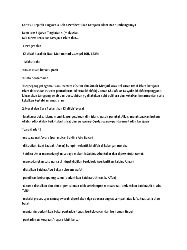 Khalifah dalam kontek agama bermaksud tanggungjawab memelihara kemurnian islam dan mengekalkan keharmonian serta kestabilan umat islam. Khutbah terakhir nabi muhamad menjelaskan aspek berikut: Pembentukan kerajaan islam dan sumbangannya (contoh soalan + cadangan jawapan). Akan memerintah dan mentadbir kerajaan islam. Pembentukan kerajaan islam dan sumbangannya t4b6 : Ini kerana selepas kewafatan baginda umat islam menghadapai dugaan besar antaranya: Bakar menjadi khalifah kerajaan islam madinah. Kemunculan tamadun dan perkembangannya di makkah, b5. Company logo penandaan kertas sejarah 1249/3. Bab 6 pembentukan kerajaan islam dan sumbangannya. 82% (57) 82% menganggap dokumen ini bermanfaat (57 suara) 42k tayangan 3 halaman. B) apakah syarat pemilihan khalifah. « newer post older post ».