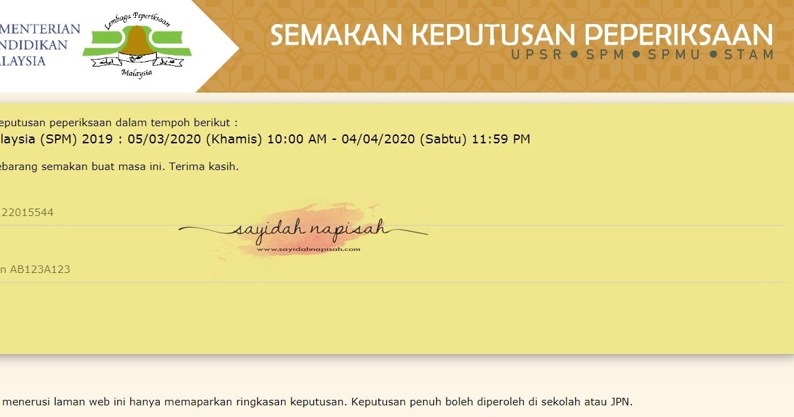Jika anda rasa tidak berpuas hati dengan keputusan yang diterima, anda boleh membuat rayuan untuk semak semula keputusan sijil pelajaran malaysia spm. Check keputusan spm & semak semula keputusan spm. Sila klik pautan berikut untuk semakan online : Cara semak keputusan sijil pelajaran malaysia 2020 online dan sms. (mp) keputusan peperiksaan sijil pelajaran malaysia (spm) tahun 2019 akan dikeluarkan pada khamis, 5 mac 2020.
